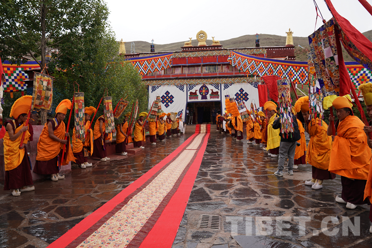 上午12時(shí)許,班禪抵達(dá)桑頂寺時(shí),天降甘露、法號齊鳴、嗩吶喧天,桑頂寺僧人組成的儀仗隊(duì)在寺廟門口舉行了隆重的歡迎儀式。