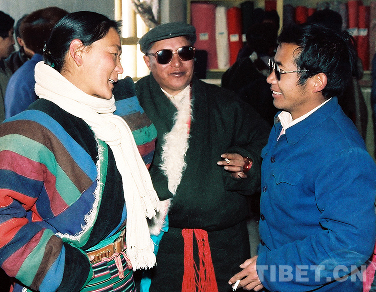 這是文部辦事處主任加央多吉(右)與參加那曲地區(qū)基層政權(quán)建設(shè)工作現(xiàn)場(chǎng)會(huì)的那曲縣縣長(zhǎng)嘎瑪(左)在交流(唐召明1989年12月份攝)