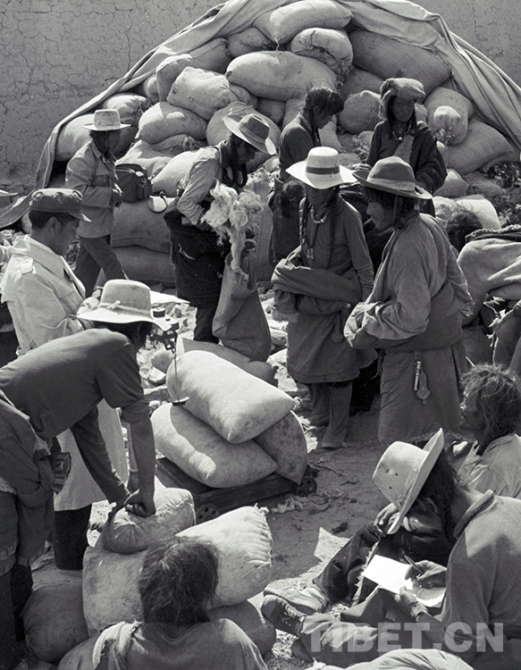 這是文部辦事處牧民群眾來(lái)到辦事處畜產(chǎn)品收購(gòu)站交售羊毛,并將羊毛裝袋過(guò)秤完成(唐召明1989年12月攝)