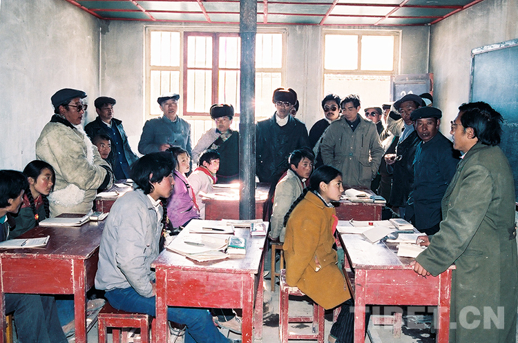 這是那曲地區(qū)“訪問(wèn)團(tuán)”人員在參觀文部辦事處小學(xué)(唐召明1989年12月份攝)