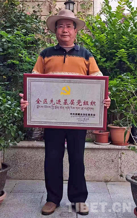這是現(xiàn)任那曲駐拉薩第十退休黨支部書(shū)記加央多吉,手捧2021年所榮獲的中共西藏自治區(qū)委員會(huì)頒發(fā)的”全區(qū)先進(jìn)基層黨組織“獎(jiǎng)牌拍照留念(唐召明提供,2021年7月份攝)