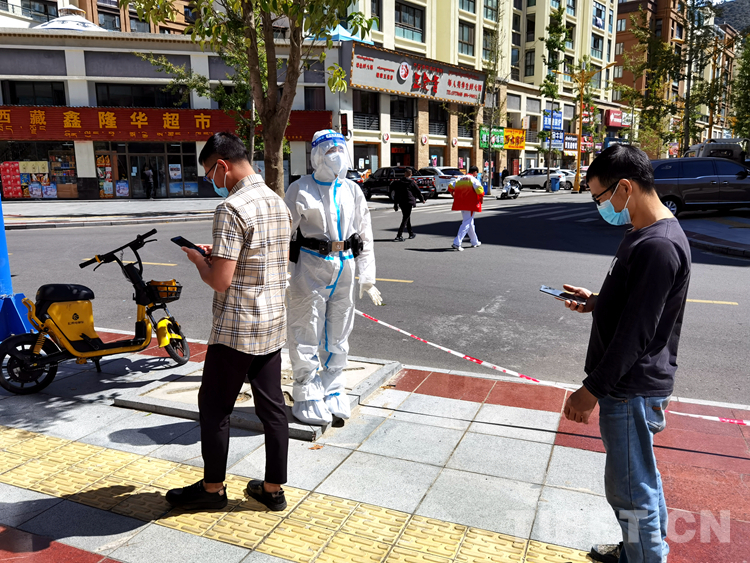 林芝邊境管理支隊(duì)機(jī)關(guān)民警曹婷正在核酸檢測點(diǎn)維護(hù)現(xiàn)場秩序 攝影:張航