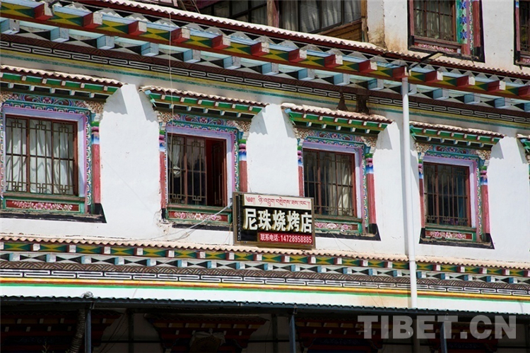 依山而建的藏式三層小樓里,丁增拉姆將房屋裝修得華麗亮堂,墻壁上繪有吉祥圖案,天花板與地板相接的立柱滿是精致的雕刻和彩繪,掛著吉祥的哈達。門外小院臺階旁的葡萄藤密密地纏繞在架子上,成串果實掛在枝頭。單獨分離出來的廚房和餐廳,也是孩子們的游樂場,沐浴著陽光下棋、讀書,一片歡聲笑語??拷鼧求w的小小花壇自然隔開了生活區(qū)和商業(yè)區(qū),一樓就是丁增拉姆家的尼珠燒烤店。沿著馬路的空地,搭建了長長的涼棚,夜晚在這里和三五好友吃著燒烤,吹著清涼的風,望著閃耀的星星,談談人生和理想,再舒服不過了。