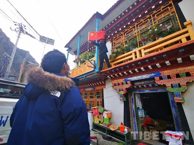 “老奶奶,我?guī)驮蹅兗野褔?guó)旗掛到門口最醒目的地方……”說(shuō)著,林芝邊境管理支隊(duì)金東邊境派出所民警楊子拿著紅旗走向了卓瑪拉姆老人家門口,在老人家門口插上了耀眼的五星紅旗。