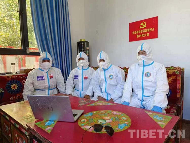 圖為10月16日上午,西藏自治區(qū)日喀則市定結(jié)縣中學(xué)隔離管控點(diǎn)一線“戰(zhàn)”疫工作人員收看黨的二十大開幕會直播