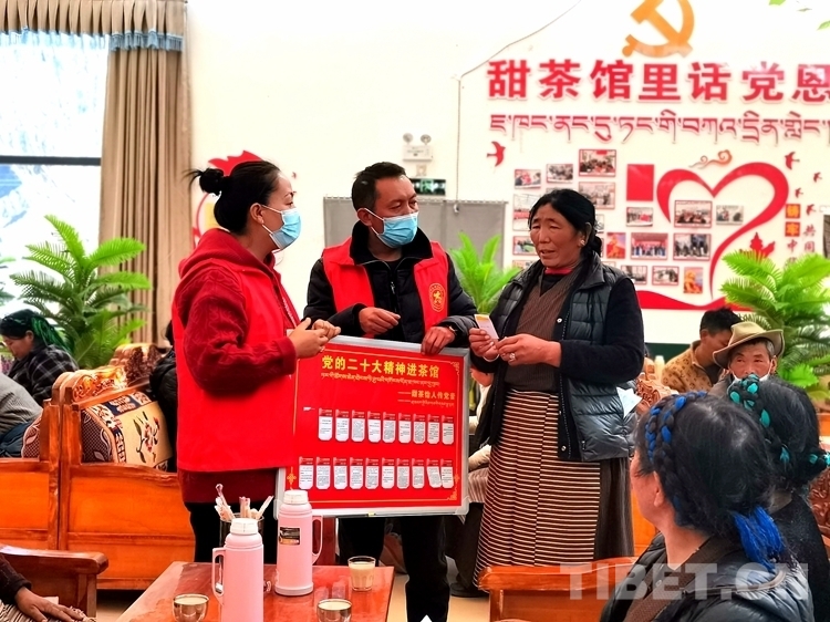 圖為山南市委宣傳部、山南市文明辦在文明實(shí)踐示范點(diǎn)開(kāi)展黨的二十大精神進(jìn)甜茶館志愿服務(wù)活動(dòng)