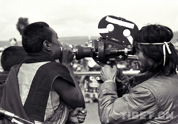 這是北京科學(xué)教育電影制片廠《萬里藏北》攝制組導(dǎo)演忻迎一,在那曲賽馬會上拍攝吹長號的僧人(唐召明1988年攝)