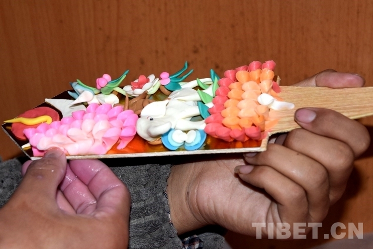 “酥油花手藝是我爸爸教給我的,然后我的弟弟、兒子的手藝是我教給他們的。去年年前一個(gè)月內(nèi),去掉其他開(kāi)銷,我一個(gè)人賺了一萬(wàn)多?!彪m然這活累了點(diǎn)兒,但在農(nóng)閑期間能有這樣一筆收入,對(duì)旦增家來(lái)說(shuō)很可觀。