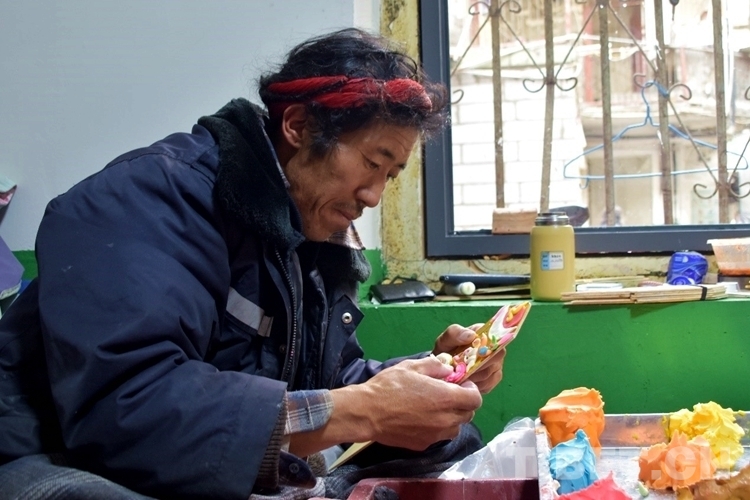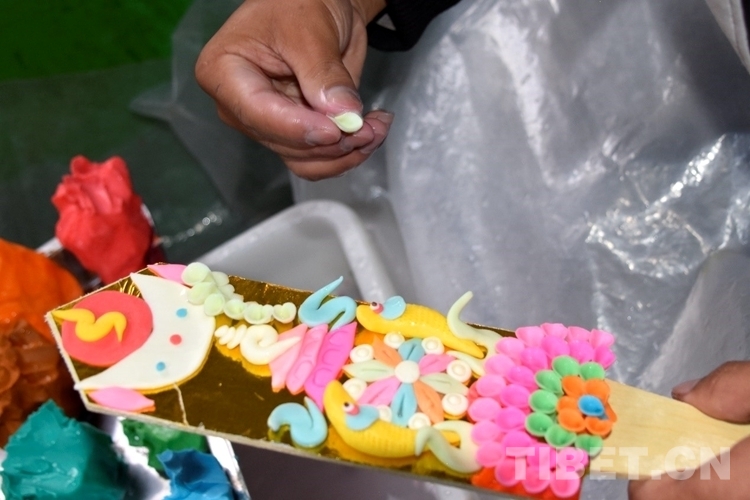 “我們一般在藏歷新年前20天左右到達(dá)拉薩。買酥油,和礦物染色原料調(diào)至成泥狀后便開(kāi)始捏制。”旦增說(shuō),普松鄉(xiāng)有制作酥油花的傳統(tǒng),每年藏歷新年臨近,他們便結(jié)伴來(lái)到拉薩制作酥油花銷售。