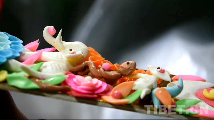 酥油花是藏民族雕塑藝術(shù)的一種特殊形式,它是以人物、花卉、樹(shù)木、飛禽、走獸等為主題的一種手工油塑藝術(shù),具有悠久的歷史。藏歷新年期間,西藏群眾會(huì)在切瑪盒的左右兩邊分別裝滿糌粑和炒青稞,然后在上面插上象征五谷豐登的“羅薩美朵”(彩色青稞穗)和寓意吉祥的酥油花。(中國(guó)西藏網(wǎng) 記者/次旦拉姆)