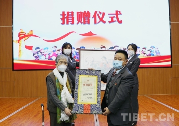 圖為中國(guó)藏學(xué)研究中心西藏文化博物館向畫家吳茜女士(左)頒發(fā)捐贈(zèng)證書