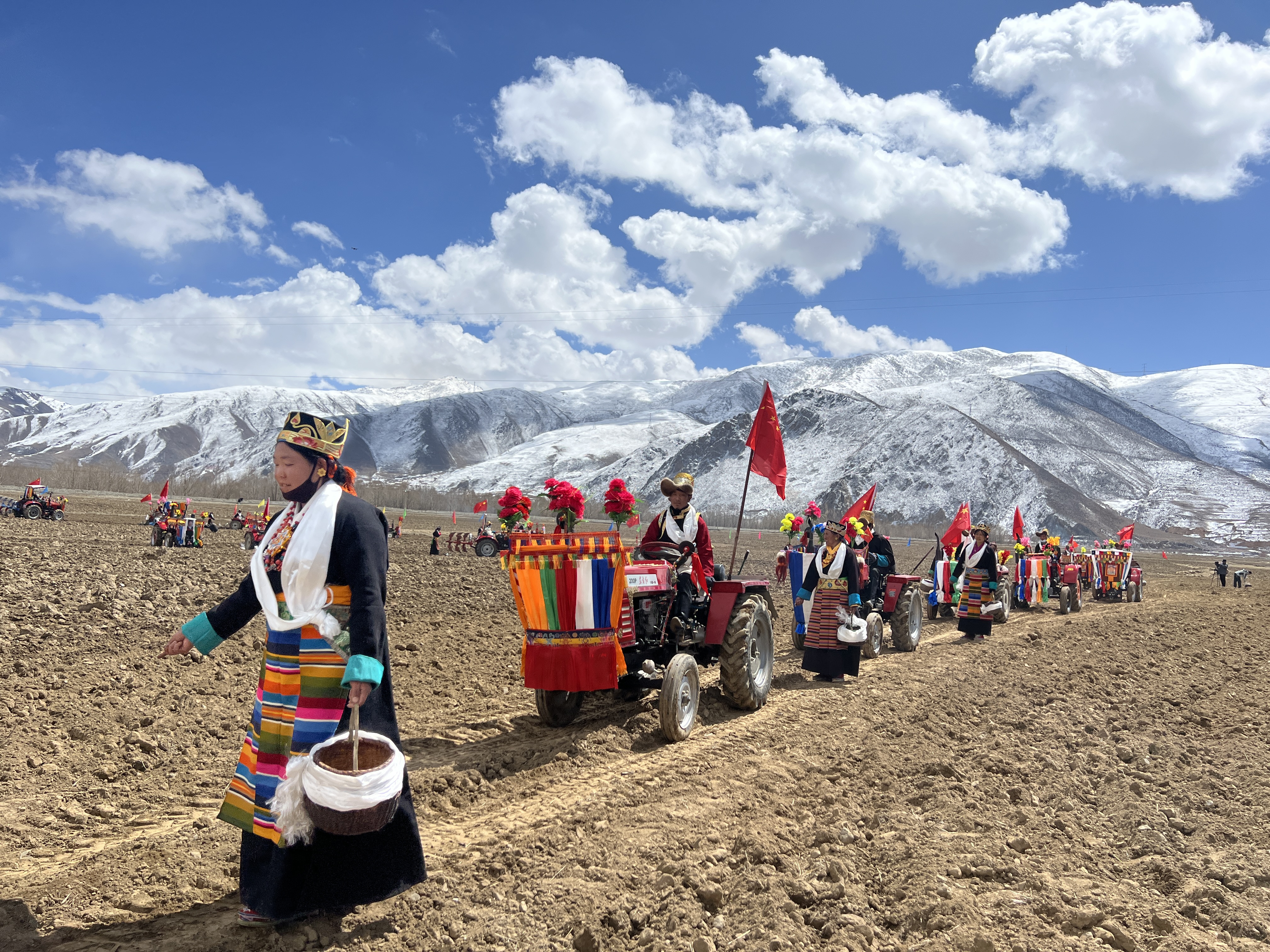 春耕,是古老土地與現(xiàn)代生活的碰撞。在西藏自治區(qū)山南市乃東區(qū)門中崗社區(qū)的春耕儀式上,身著盛裝的村民在薩日索當(dāng)中拋灑著青稞種子。這塊位于西藏歷史上第一座宮殿雍布拉康南側(cè)的農(nóng)田,也是西藏第一塊種植谷物的農(nóng)田,見證了西藏先民從“逐水草而居”的游牧生活向“日出而作,日落而息”的農(nóng)耕生活的轉(zhuǎn)變,開啟了西藏農(nóng)耕歷史。