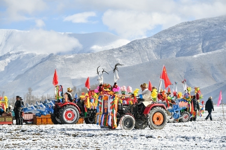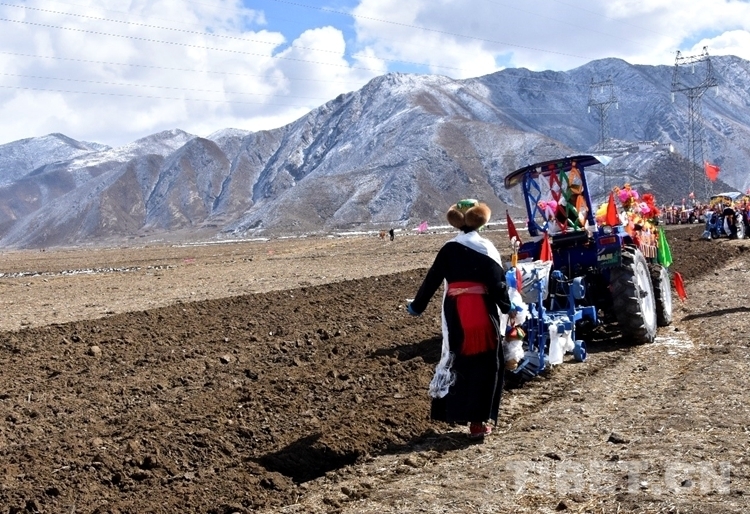 在雪水浸潤過的肥沃土地上,深耕機(jī)車輪翻滾而過,駛過的土地上翻起深色的泥土,婦女們跟在后面播撒青稞良種。
