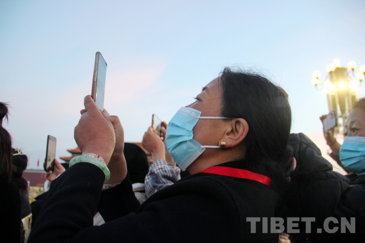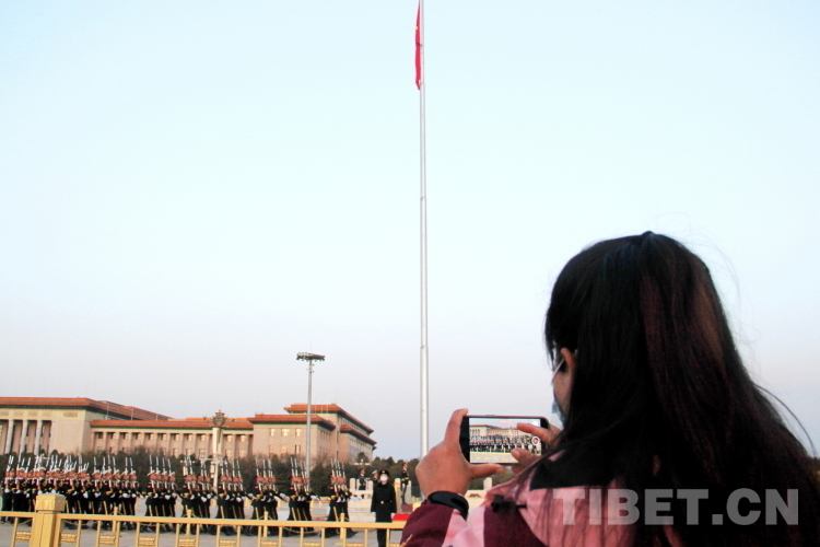清晨6時(shí)許,軍樂團(tuán)在天安門廣場就位?!罢阶?!”隨著一聲響亮的口令,國旗護(hù)衛(wèi)隊(duì)邁著鏗鏘的正步,拱衛(wèi)國旗走過天安門城樓、金水橋?!跋驀炀炊Y!”6時(shí)9分,隨著響亮的口令,軍樂團(tuán)奏響了國歌《義勇軍進(jìn)行曲》,升旗手高高揚(yáng)起國旗,鮮艷的五星紅旗迎著朝陽冉冉升起?!?023年西藏基層?jì)D聯(lián)干部赴京學(xué)習(xí)參觀團(tuán)”成員們紛紛用手機(jī)記錄下這難忘的時(shí)刻。