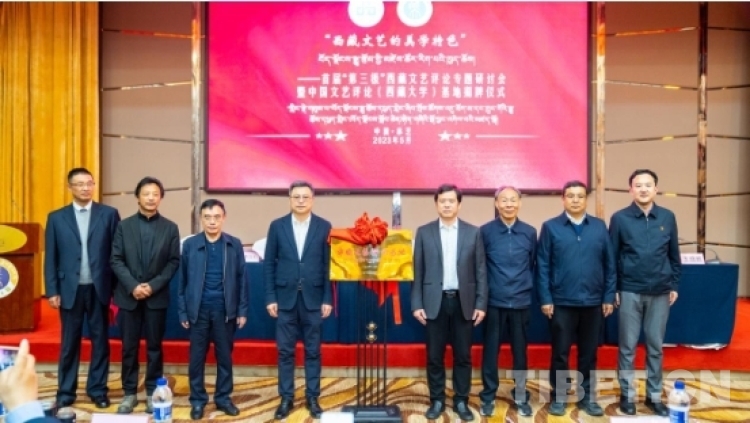 圖為出席領(lǐng)導(dǎo)共同為中國文藝評(píng)論(西藏大學(xué))基地揭牌