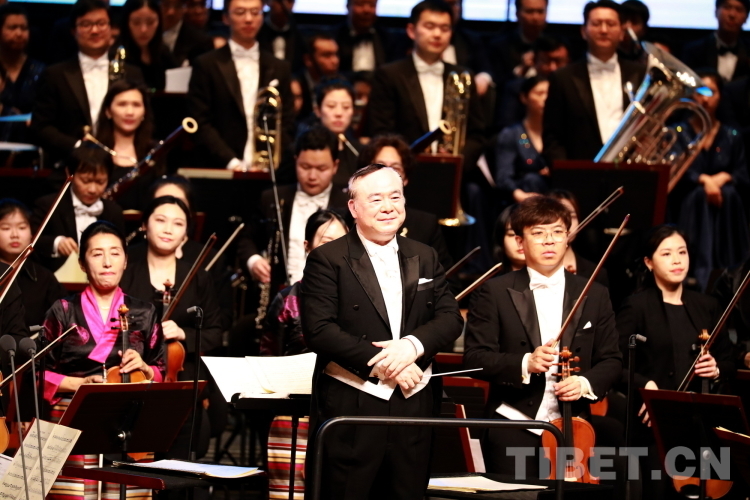本場音樂會由中國文聯副主席、書記處書記,中央音樂學院院長,著名指揮家俞峰擔任指揮,中央音樂學院交響樂團與西藏自治區(qū)歌舞團愛樂樂團聯合伴奏。圖為本場音樂會指揮俞峰(前排中) 攝影:劉莉