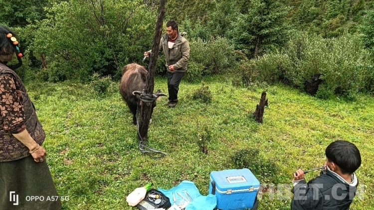 只見那頭受傷的牛被拴在木樁上,尾巴處還帶有一些血跡,顯得非常虛弱。索杰醫(yī)生先是把手術(shù)的傷口處仔細檢查了一遍,然后取來藥箱,在傷口處給藥,他告訴牧民家的男主人,牛恢復(fù)得還可以,不要太擔(dān)心,留下的藥是這幾天涂抹和口服的,要按時服用。