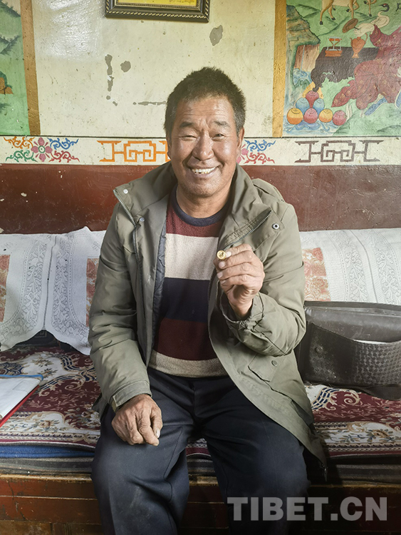 索杰醫(yī)生取出第三個包的時候,格外小心翼翼。我們因此也就更好奇,里面又是什么“寶藏”?!拔?986年入黨,1997年當(dāng)村大隊的副隊長。2010年,鄉(xiāng)里在12個村的大隊長中,選兩名優(yōu)秀人員,我就是其中之一?!彼鹘茚t(yī)生邊說,邊慢慢拿出一個盒子,打開盒蓋,把手在衣服角上抹抹,然后取出一枚金黃閃亮的毛主席像章?!爱?dāng)時我們縣一共去了20人,先到那曲市委黨校學(xué)習(xí)了8天,然后到北京和大連分別參觀學(xué)習(xí)7天。在北京,我去了毛主席紀念堂、天安門、長城、鳥巢、水立方。我在天安門廣場買了鮮花,到毛主席紀念堂門口時,先是有點緊張,因為那里站崗的軍人。我把鮮花放在一個統(tǒng)一的地方,瞻仰毛主席遺容時,我緊張的心情一下子沒有了,都變成了激動?!彼鹘茚t(yī)生把手放在心臟的位置比劃著,“為了紀念毛主席,我就買了一枚毛主席像章?!?/p>
