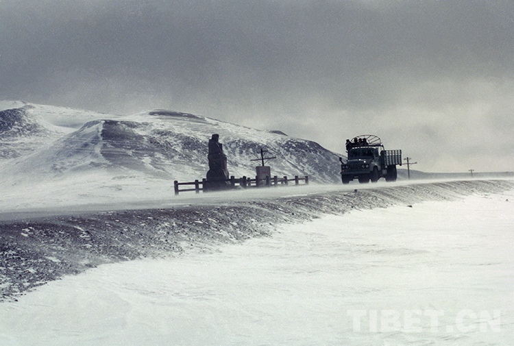 在風(fēng)雪彌漫的唐古拉山上,一輛汽車正在通過山口(唐召明1991年攝)