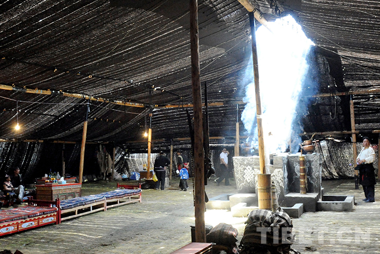 在那曲賽馬盛會上供游人參觀的“巴拿扎西林杰大黑帳”內(nèi)景。這頂大“黑帳”占地面積3600平方米、內(nèi)部有效面積666平方米,可供上百人自由活動(唐召明2009年8月12日攝)