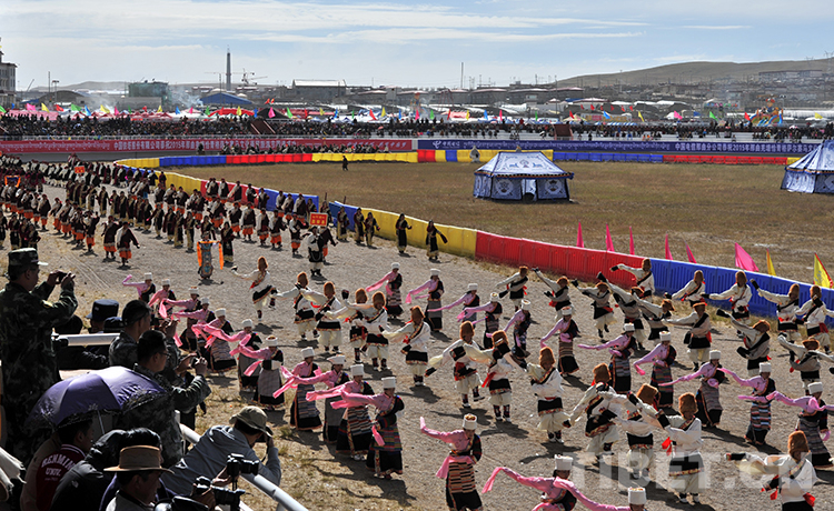 來自那曲地區(qū)(現(xiàn)那曲市)各縣代表隊在進行入場式表演。當(dāng)日,那曲賽馬節(jié)在藏北首府那曲鎮(zhèn)開幕(唐召明2013年8月10日攝)