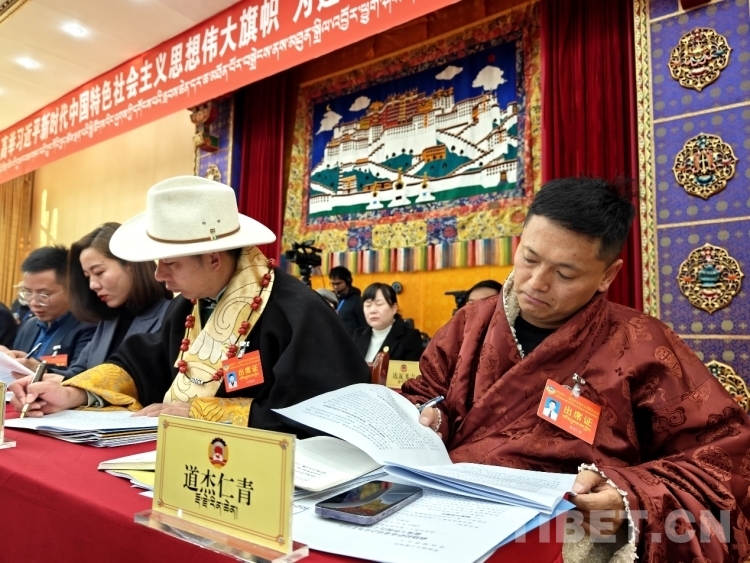 圖為政協(xié)委員認(rèn)真審閱會議資料 攝影:次旦拉姆