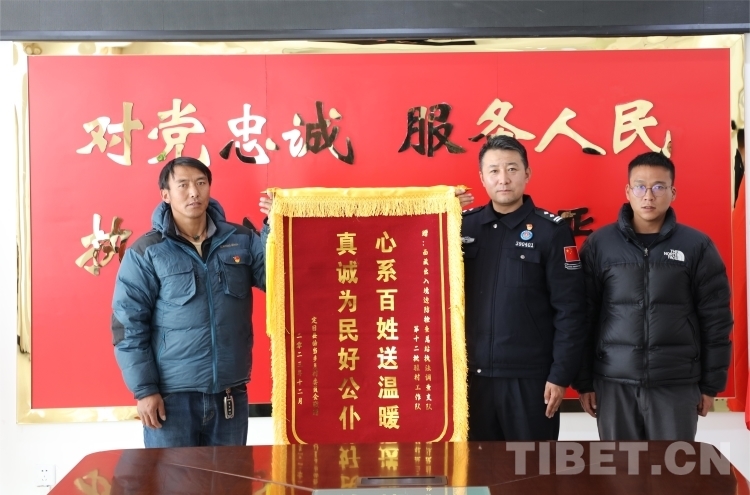 圖為曲當鄉(xiāng)差村支部書記向西藏邊檢總站執(zhí)法調(diào)查支隊駐村民警送錦旗 高昱攝