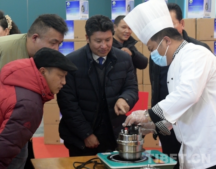 那曲市委常委、常務(wù)副市長白瑪羅布(中)在捐贈活動現(xiàn)場,觀看高原節(jié)能鍋的使用演示(唐召明2023年12月26日攝)