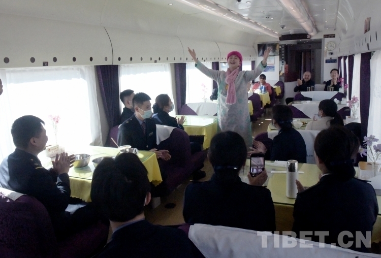 首次進(jìn)藏的著名歌唱家、協(xié)會公益愛心大使黃春燕在從拉薩到那曲的列車上為“天路”列車員演唱膾炙人口的《天路》之歌(唐召明2023年12月25日攝)