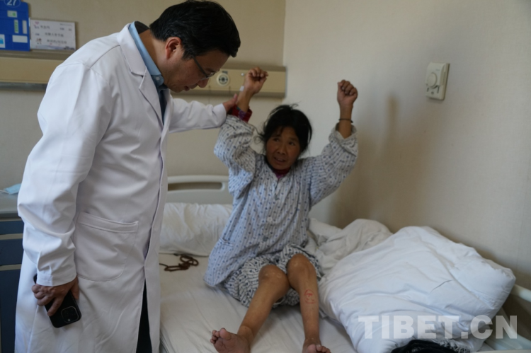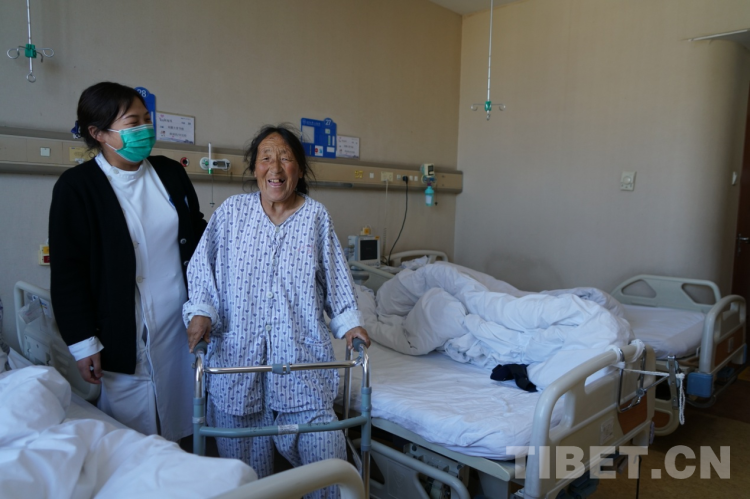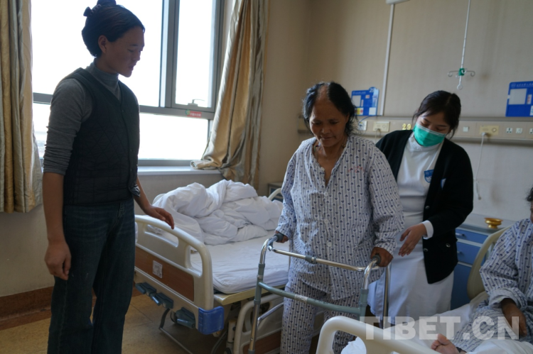 “卓瑪,你快給媽媽翻譯一下,用扶手架轉身的時候90度慢慢轉,不要一次性轉180度,容易摔倒。”骨關節(jié)科護士薛小英從剛剛的驚慌中回過神來,對著29床病人布姆的女兒大聲叮囑道。就在剛才,這個來自洛隆縣59歲的右膝大骨節(jié)病患者布姆在骨關節(jié)手術24小時后,借助扶手架,在護士的指導下已經(jīng)能夠下床走路了。只是初次使用扶手架還不太熟悉,剛才180度的大轉彎讓一旁陪護的護士不禁捏了一把汗。女兒卓瑪聽到護士的話后趕忙告訴媽媽走路轉身要慢點,小心別摔倒。