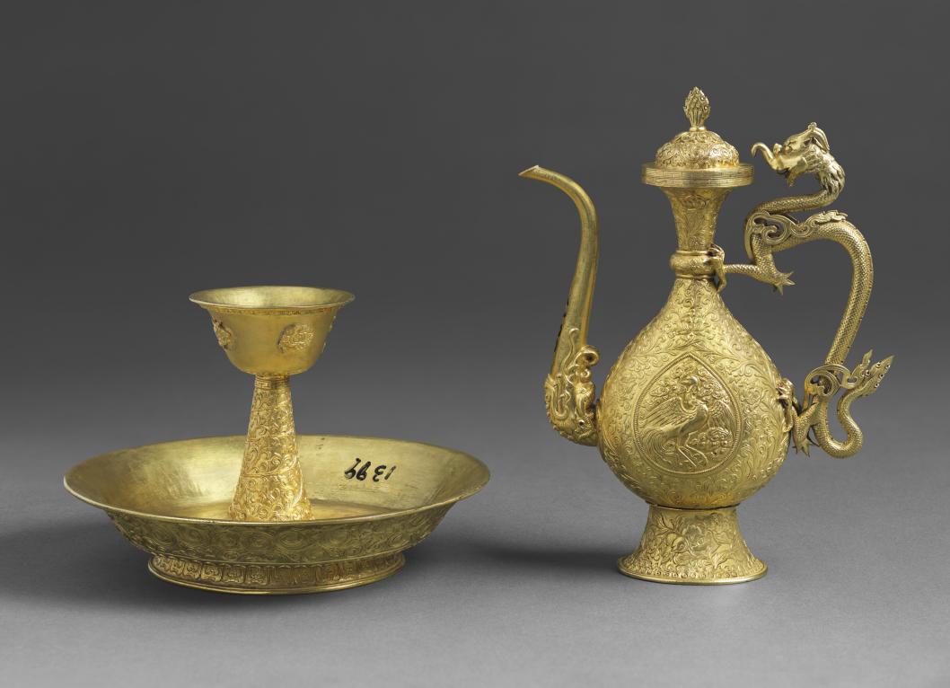 圖為公元18-19世紀(jì)龍柄執(zhí)壺及盤(pán)、杯
