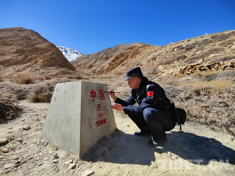 巡邏結(jié)束回到執(zhí)勤點(diǎn)后,邊巴次仁并沒(méi)有卸下執(zhí)勤裝備,而是拿著毛筆和紅油漆朝著執(zhí)勤點(diǎn)的河對(duì)岸走去,過(guò)河幾百米便是中尼5號(hào)界樁?!爸挥袌?jiān)守在邊境的我們才能體驗(yàn)到,除夕這天,為界碑描紅的自豪感。”他拿出毛筆跟紅漆一筆一劃地描著界碑上的每一個(gè)字。“描紅界碑那一刻,眼前是界碑,身后是祖國(guó),我們守的是萬(wàn)家燈火?!边叞痛稳恃凵駡?jiān)定地看著身前的界碑說(shuō)。