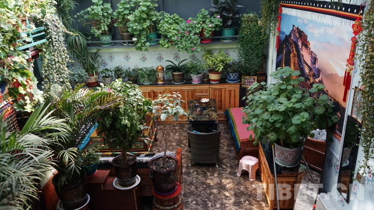 德瓊家庭旅館以女主人次仁德瓊的名字命名。工作人員告訴我們,這里是拉康鎮(zhèn)生意最好的旅館之一。旅館位于兩條主干道交接的拐角,地理位置好,招牌也立得醒目,每個(gè)進(jìn)入鎮(zhèn)子的人第一眼就能看到德瓊家庭旅館的招牌。但生意好絕不僅僅是因?yàn)榈乩砦恢脙?yōu)越。走進(jìn)這間旅館,如同進(jìn)入一間溫室花棚。在這里,花草植物是絕對(duì)的主角,各色草本、藤本、灌木植物高低錯(cuò)落,幾乎填滿了墻壁空間。蕭瑟的冬日里,粉的、白的、紅的花朵擠擠挨挨地開著,茉莉、山茶、三角梅...來自不同地域的花卉植物在這邊境小鎮(zhèn)的一隅競相綻放,天南海北在此握手言和。德瓊阿佳用她對(duì)生活的熱情將家庭旅館裝點(diǎn)得生機(jī)盎然,我想正是這份純真的熱愛才是德瓊家庭旅館生意火爆的關(guān)鍵所在。