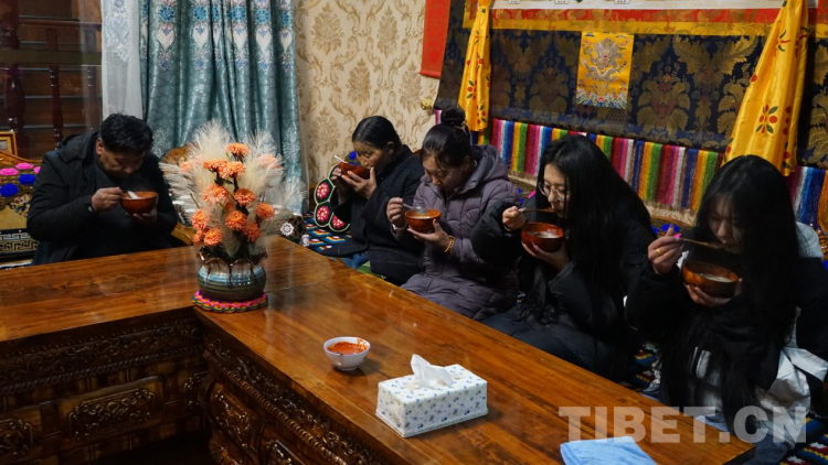 下午時(shí)分,“古突”夜的準(zhǔn)備就開始了,先是將羊肉放入鍋中燉煮,再是將白蘿卜切片備好,隨后與奶奶、兩個(gè)女兒及丈夫,一家人圍坐在溫暖的廚房說說笑笑地捏“古突”里的面疙瘩,做面疙瘩時(shí),要準(zhǔn)備一些稍大的特殊面疙瘩,分別包進(jìn)寫有石子、辣椒、羊毛、木炭等字樣的紙條,代表“心腸硬”“刀子嘴”“心腸軟”“黑心腸”等含義,待到吃“古突”環(huán)節(jié),來一場藏式風(fēng)格的“開盲盒”,據(jù)說每個(gè)人吃到的字樣能在某種程度上代表新一年的運(yùn)勢(shì)或性格。