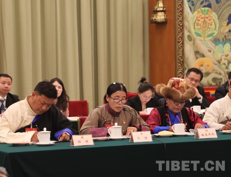 圖為其德在十四屆全國(guó)人大二次會(huì)議西藏代表團(tuán)開(kāi)放團(tuán)組會(huì)議上發(fā)言 攝影:桑吉