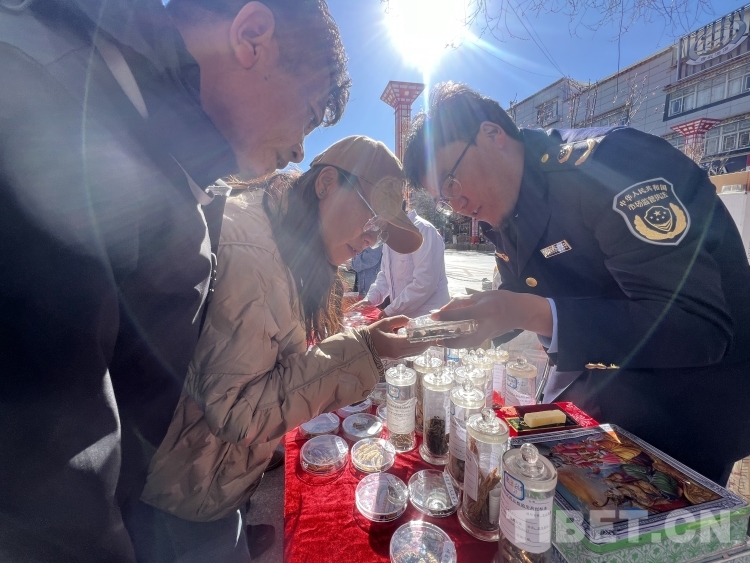 圖為西藏自治區(qū)煙草專賣局工作人員向來往群眾展示違規(guī)電子煙 攝影:德吉卓瑪