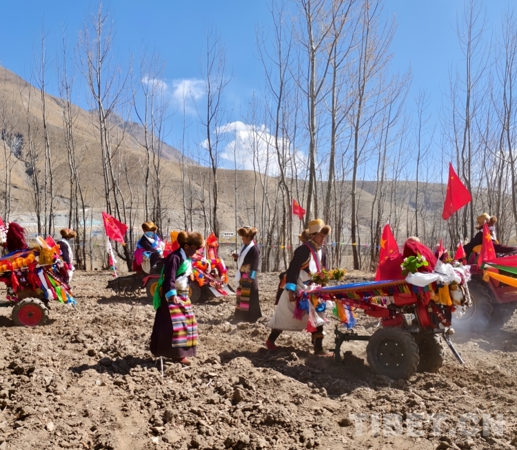 當(dāng)天,村里的男女老少穿上節(jié)日盛裝,手捧哈達,高舉青稞美酒,從村子的各個角落來到村東頭一塊叫作“聶西滅”的肥沃土地上,男人們駕駛著用彩旗、花束妝點的拖拉機,伴隨著一陣陣轟鳴聲,春耕儀式正式開始。新耕的第一犁,由一個屬相與今年屬相相符的婦女撒出吉祥、幸運的種子,其余的拖拉機一對跟著一對地翻耕,每臺拖拉機后面都跟隨著一位盛裝的婦女,她們左手提一桶種子,右手有節(jié)奏地揮擺,翻出沉寂一冬、透著泥土芬芳的肥沃土地,把種子撒入希望的田野。翻耕結(jié)束后,各家各戶把春耕歡慶時用的青稞酒、卡賽、切瑪?shù)葦[放在供桌上,孩子們在田間喧鬧戲耍,將村民們其樂融融、喜氣洋洋的美好生活景象體現(xiàn)的淋漓盡致。