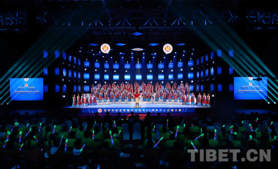 圖為西藏自治區(qū)拉薩市紀(jì)念西藏民主改革65周年千人合唱大賽在拉薩師范高等專科學(xué)校體育館舉行