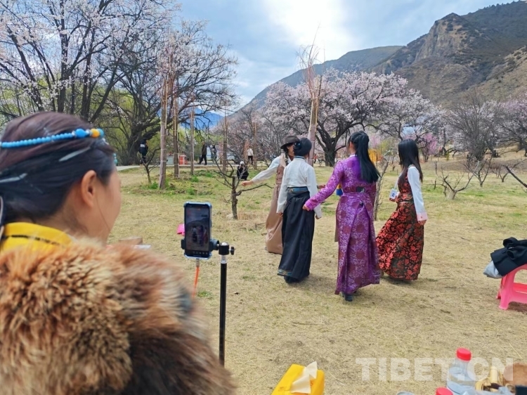 圖為林芝市職業(yè)技術(shù)學(xué)校的學(xué)生們在嘎拉桃花村進(jìn)行直播