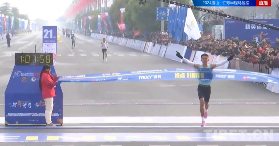 圖為2024仁壽半程馬拉來自西藏自治區(qū)運動員扎西次仁奪冠并打破全國半馬記錄