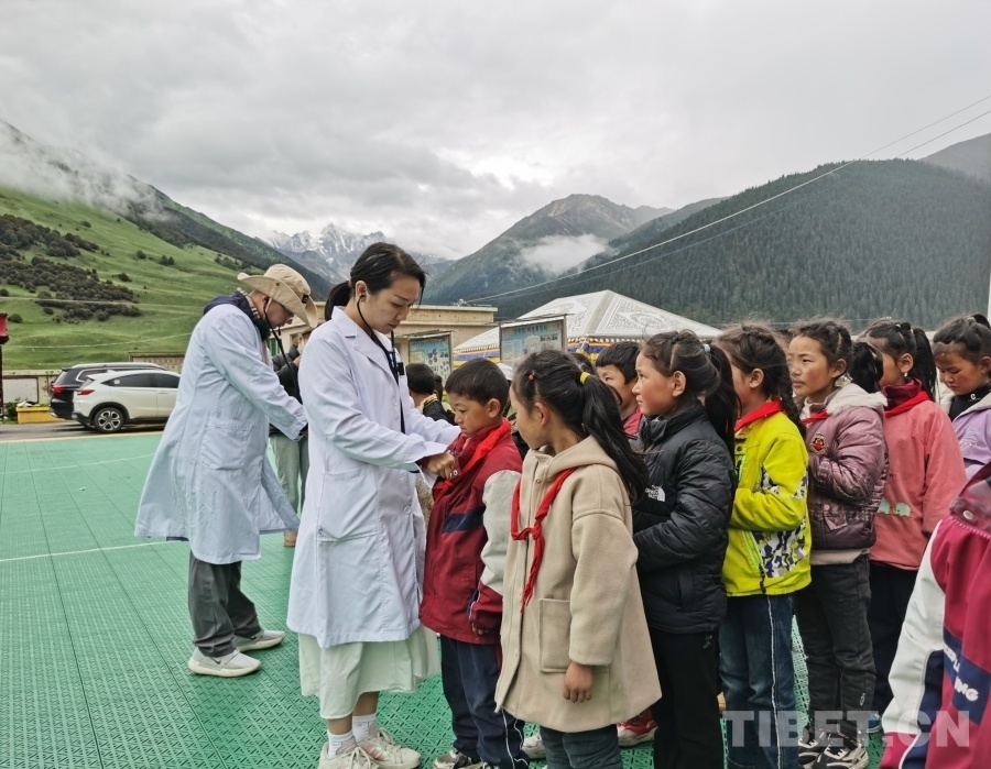 圖為醫(yī)療專家團隊在巴塘縣波密鄉(xiāng)格木村中心小學(xué)開展先心病篩查聽診工作 攝影:白瑪司郎