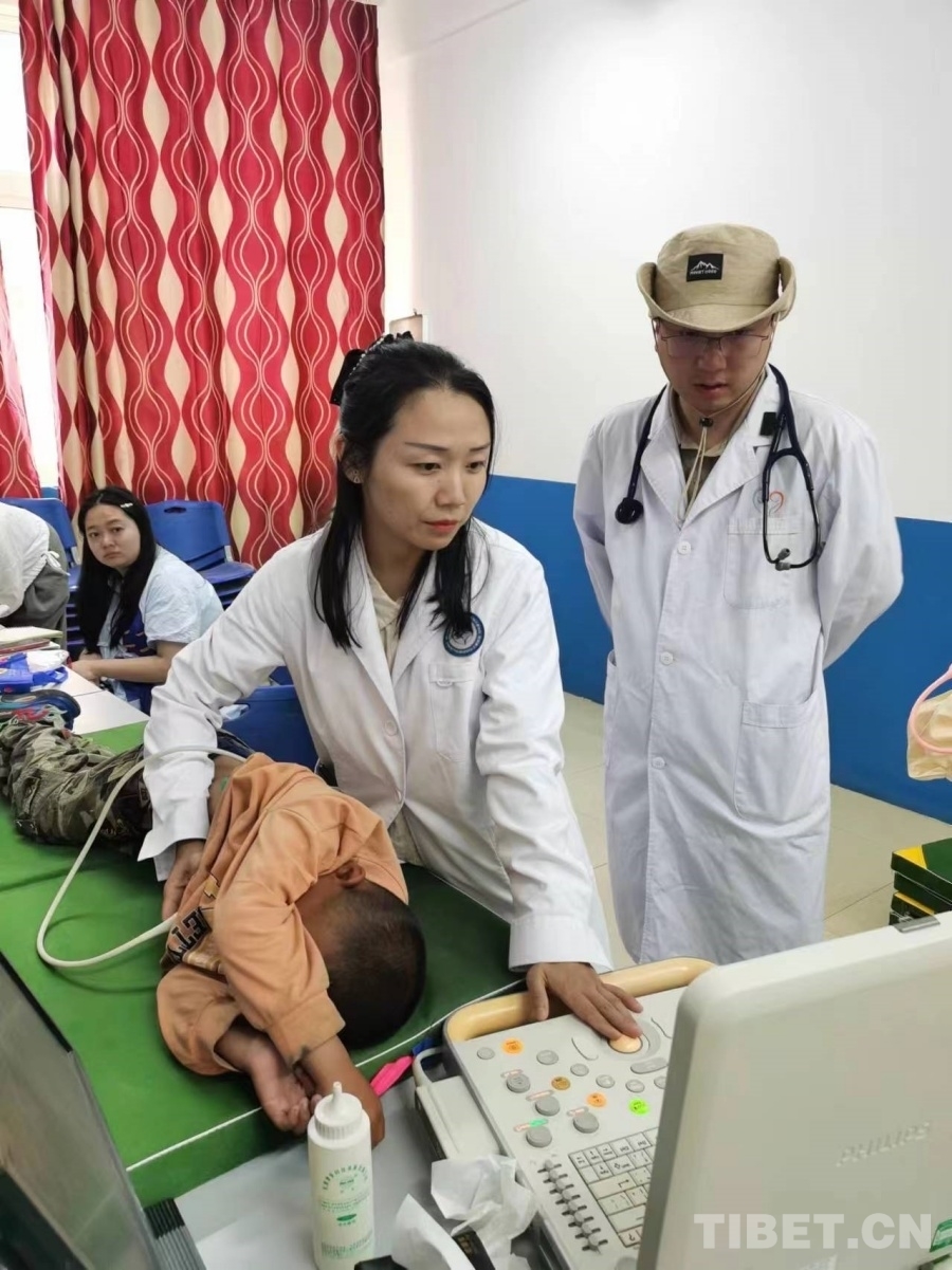 圖為醫(yī)療專家團隊在給疑似先心病患兒做心臟超聲檢查 攝影:白瑪司郎