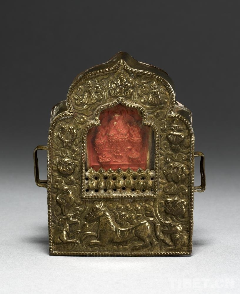 19號藏品為銅制“嘎烏”,內(nèi)裝有“擦擦”和香料包,出自西藏,進入館藏時間為1905年。“嘎烏”,是藏語的音譯,指護身佛的盒子,即小型佛龕。盒子里一般裝有“擦擦”佛像、印著經(jīng)文的綢片、舍利子或者甘露丸、由高僧念過經(jīng)的藥丸,以及活佛的頭發(fā)、衣服的碎片等?!案聻酢边€是精美的裝飾品。其形狀不一,一般為銀質(zhì)或銅質(zhì),盒面上鑲嵌有瑪瑙、綠松石,雕刻有多種花紋圖案。