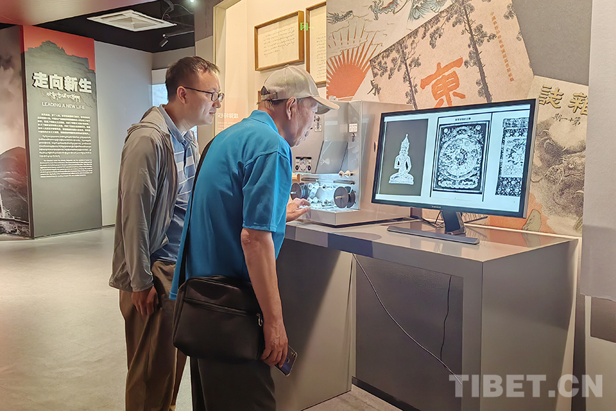 圖為紀(jì)念西藏江孜抗英保衛(wèi)戰(zhàn)120周年主題展現(xiàn)場(chǎng),觀眾通過(guò)膠片機(jī)了解被英國(guó)劫掠的西藏文物 攝影:楊月云