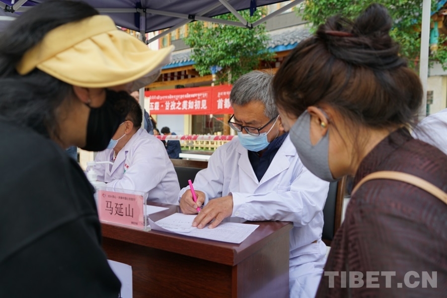 圖為7月7日,北京豐臺(tái)醫(yī)院副院長(zhǎng)馬延山在白玉縣新時(shí)代文明廣場(chǎng)義診點(diǎn) 攝影:周晴晴