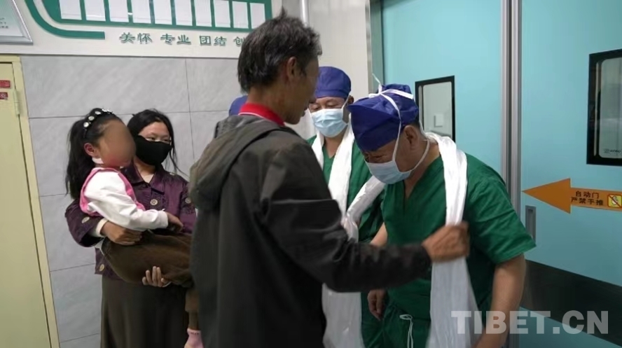 圖為7月10日,手術(shù)成功后,患兒家長(zhǎng)為醫(yī)療專(zhuān)家獻(xiàn)上哈達(dá)表達(dá)感謝 攝影:周晴晴