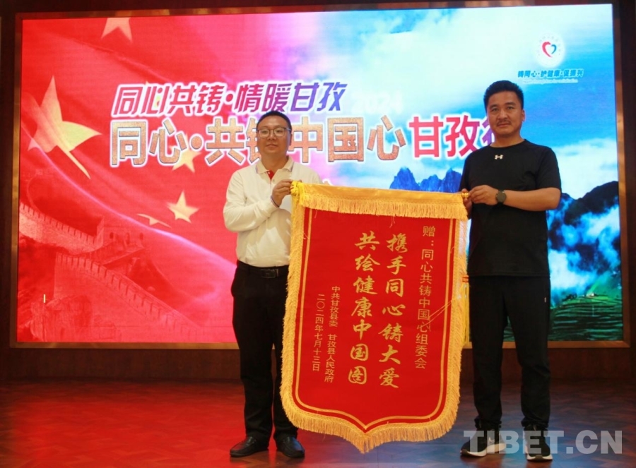 圖為甘孜縣縣委副書記、縣長(zhǎng)其太(右)向“同心·共鑄中國(guó)心”組委會(huì)贈(zèng)送錦旗 攝影:劉莉