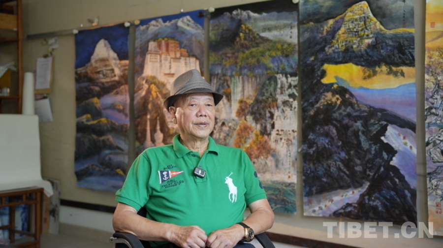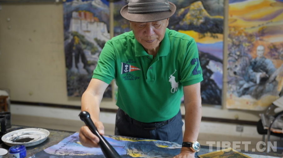 尼瑪澤仁:如果看到這幾幅畫,肯定會(huì)感覺跟其他山水畫不一樣,因?yàn)槲疫\(yùn)用了艷麗的色彩去形成強(qiáng)烈的對比。我想通過這樣的色彩,有別于江南的秀麗,展現(xiàn)出雪域高原獨(dú)特的山水。這里面飽含著熱情,山體會(huì)沖擊你的視野,會(huì)打動(dòng)你的心靈,給予你靈魂上的震撼。
