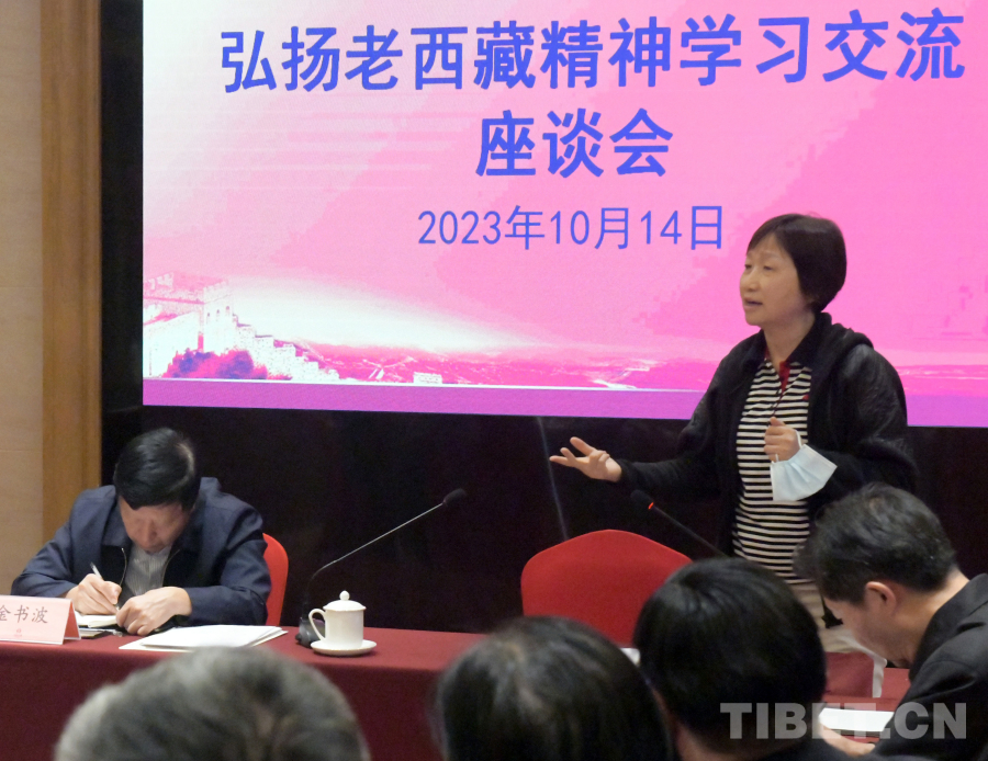 圖為北京建藏援藏工作者協(xié)會副會長張小康在協(xié)會召開的“弘揚(yáng)老西藏精神學(xué)習(xí)交流座談會”上介紹“老西藏精神”(唐召明2023年10月14日攝)