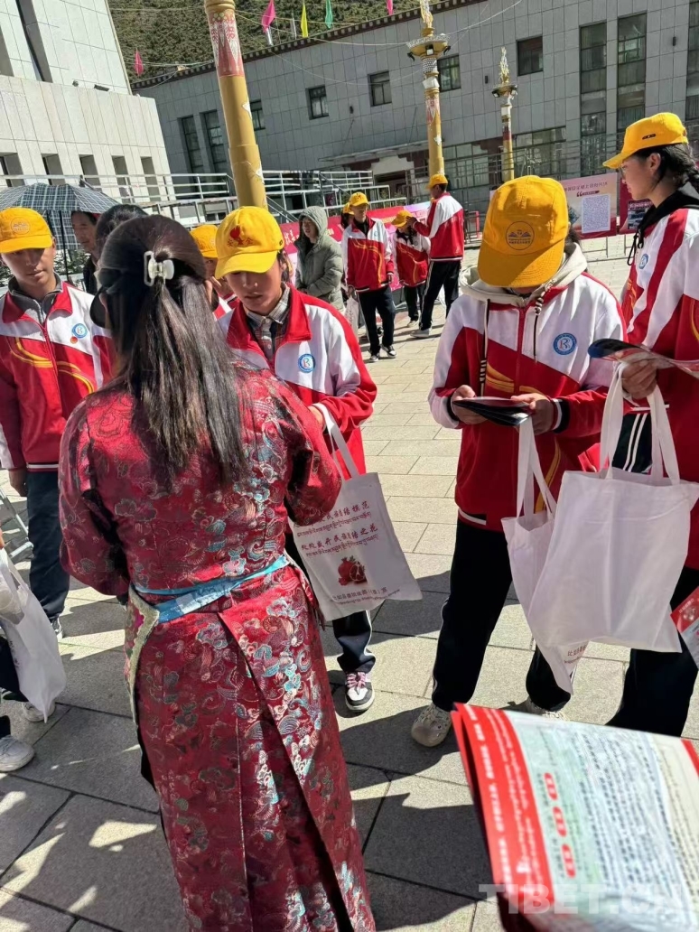 圖為工作人員為學生發(fā)放宣傳資料 圖片由比如縣委統(tǒng)戰(zhàn)部提供
